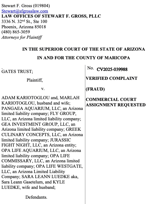 The lawsuit alleges that Adam Kariotoglou misappropriated over $3,254,587.27 in investor funds for personal expenses—including luxury goods, elective medical procedures, and transfers to affiliated entities such as Fly Group LLC, GEA Investment Group LLC, and others.